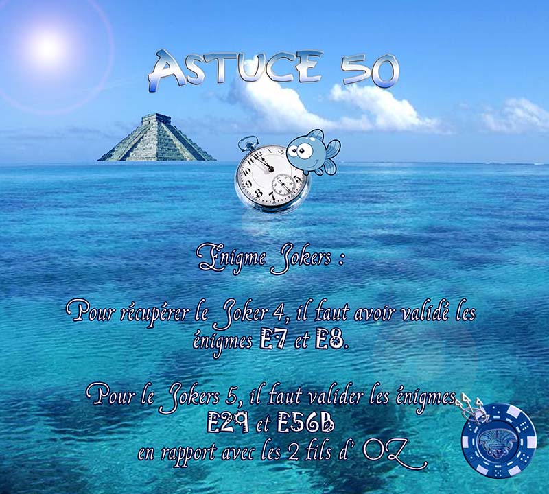 En répondant correctement aux énigmes E46, E47 et E49 qui étaient liées du fait de leurs solutions non localisées sur Terre, vous accédiez à la fameuse question " double " vous permettant de gagner le 2ème gain bonus. (E2G) : NB : L'autre solution pour récupérer ce texte était de trouver le coffre aux 10 Soleils disposé dans la Sombre Grotte aux Chauve-souris. (Voir E64)