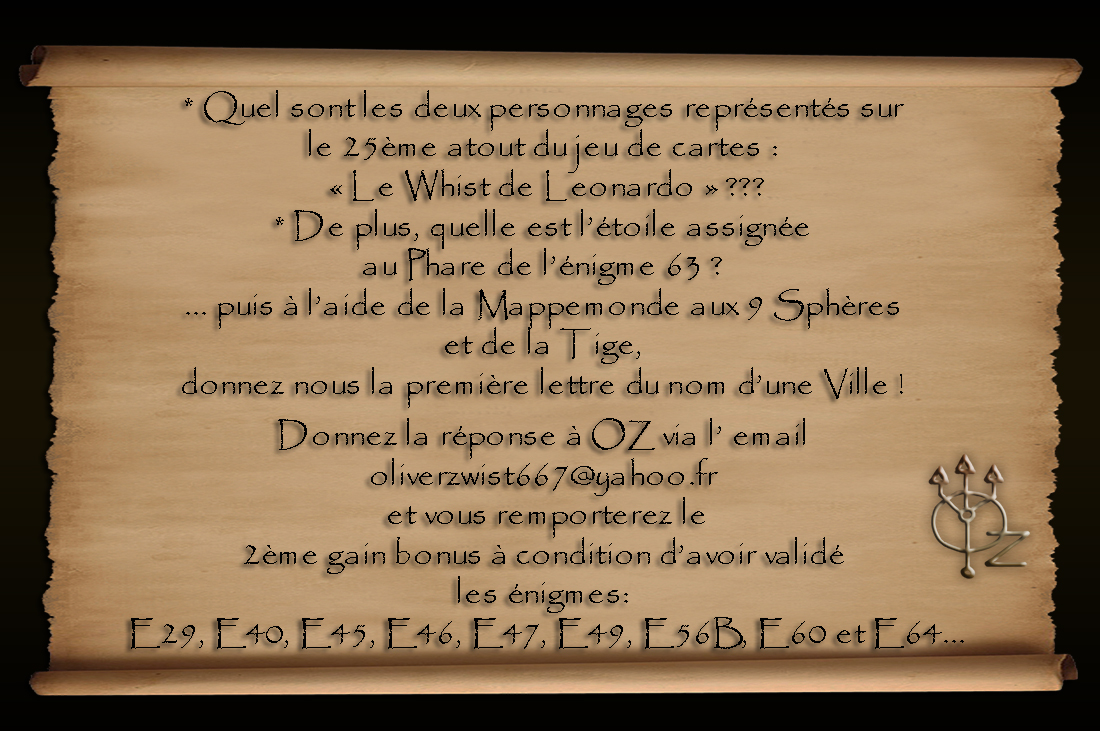 En répondant correctement aux énigmes E46, E47 et E49 qui étaient liées du fait de leurs solutions non localisées sur Terre, vous accédiez à la fameuse question " double " vous permettant de gagner le 2ème gain bonus. (E2G) : NB : L'autre solution pour récupérer ce texte était de trouver le coffre aux 10 Soleils disposé dans la Sombre Grotte aux Chauve-souris. (Voir E64)